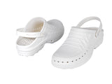 The Stella clog white is a Unisex occupational clog entirely made of polymeric materials footwear suitable for people who spend a great amount of time standing up or walking such as estheticians and nurses in spas and medical spas, wellness centers, beauty salons, cosmetic centers, pharmacies, dental and medical professionals, laboratories environments as well as hotel kitchens and cleaning personnel. They combine technical and therapeutic features such as: impact absorption, leg muscular relaxation, temperature and moisture control, anatomic insole and reduction of static energy.